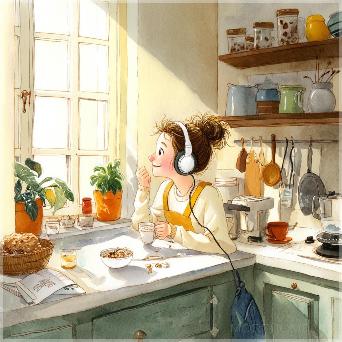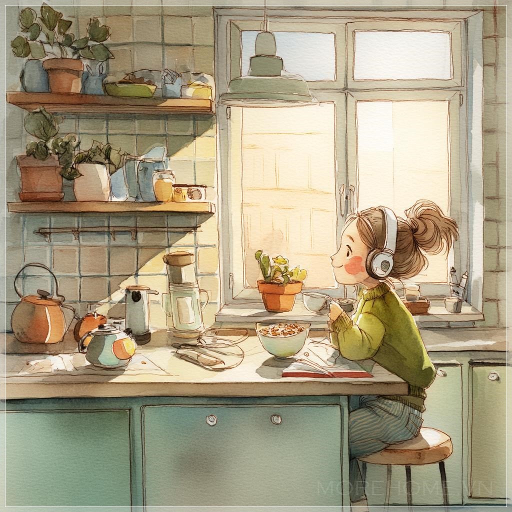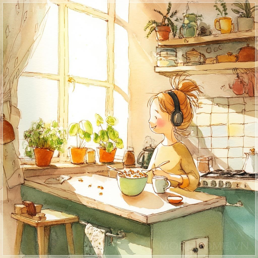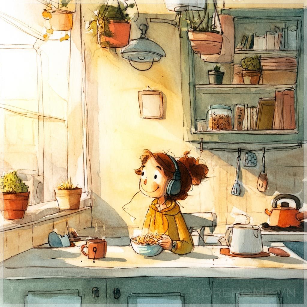 Không gian bếp là một trong những khu vực quan trọng nhất trong ngôi nhà, nơi không chỉ là nơi chuẩn bị bữa ăn mà còn là nơi gia đình quây quần, chia sẻ những khoảnh khắc đẹp. Một bức tranh minh họa nước màu về một căn bếp gọn gàng, tràn ngập ánh sáng tự nhiên là hình ảnh khiến ta cảm thấy ấm áp và thư giãn. Bức tranh không chỉ là một tác phẩm nghệ thuật mà còn mang lại cảm giác thoải mái, dễ chịu cho người nhìn. Cô gái nhỏ trong bức tranh, trong bộ đồ thoải mái, đang thưởng thức bữa sáng nhẹ nhàng trong không gian bếp sáng sủa, với âm thanh của podcast nhẹ nhàng vang lên, mang lại một cảm giác yên bình, thư thái.