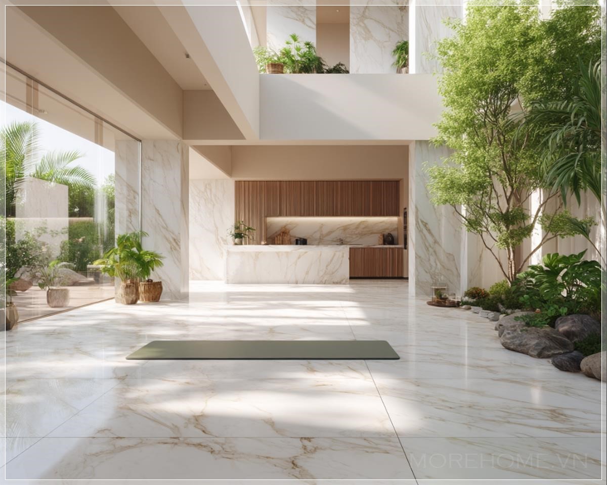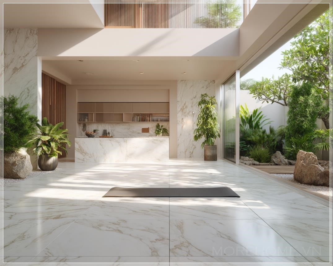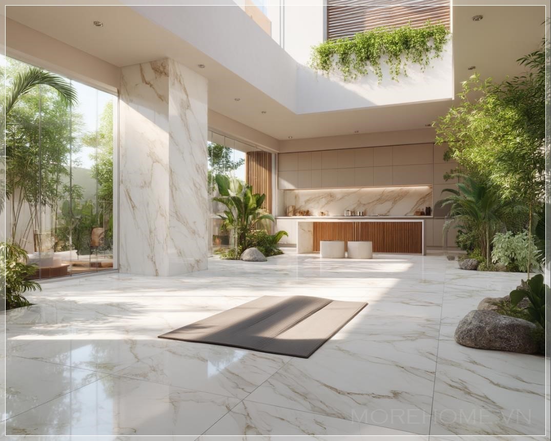 Ánh sáng tự nhiên từ mặt trời chiếu qua những tán lá, tạo ra những bóng mờ nhẹ nhàng trên mặt sàn marble, làm cho không gian trở nên sinh động và tươi mới. Kết hợp với khu bếp hiện đại, nơi có thiết kế mở và tiện nghi, không gian này không chỉ là nơi để thư giãn mà còn phục vụ nhu cầu sống hiện đại. Các chi tiết nhỏ như ánh sáng từ đèn led mềm mại, các vật liệu tự nhiên trong thiết kế đều mang đến một không gian sống hoàn hảo, kết hợp giữa sự tiện nghi và gần gũi với thiên nhiên.