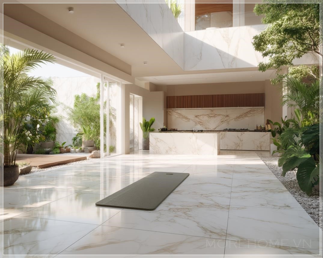 Khu vườn ngoài trời rộng lớn, được thiết kế với sàn đá marble trắng, cùng tấm thảm yoga nằm ngay trung tâm, mang lại một không gian thư giãn và yên bình. Cảnh vật xung quanh là những cây xanh tươi mát, tạo nên một bầu không khí lý tưởng cho những buổi tập luyện nhẹ nhàng hoặc đơn giản là để thưởng thức vẻ đẹp của thiên nhiên. Phía trước, khu bếp hiện đại mở ra một không gian sống đẳng cấp, tinh tế nhưng cũng không kém phần gần gũi, thể hiện rõ nét phong cách sống hiện đại, thanh thoát và hài hòa với thiên nhiên.