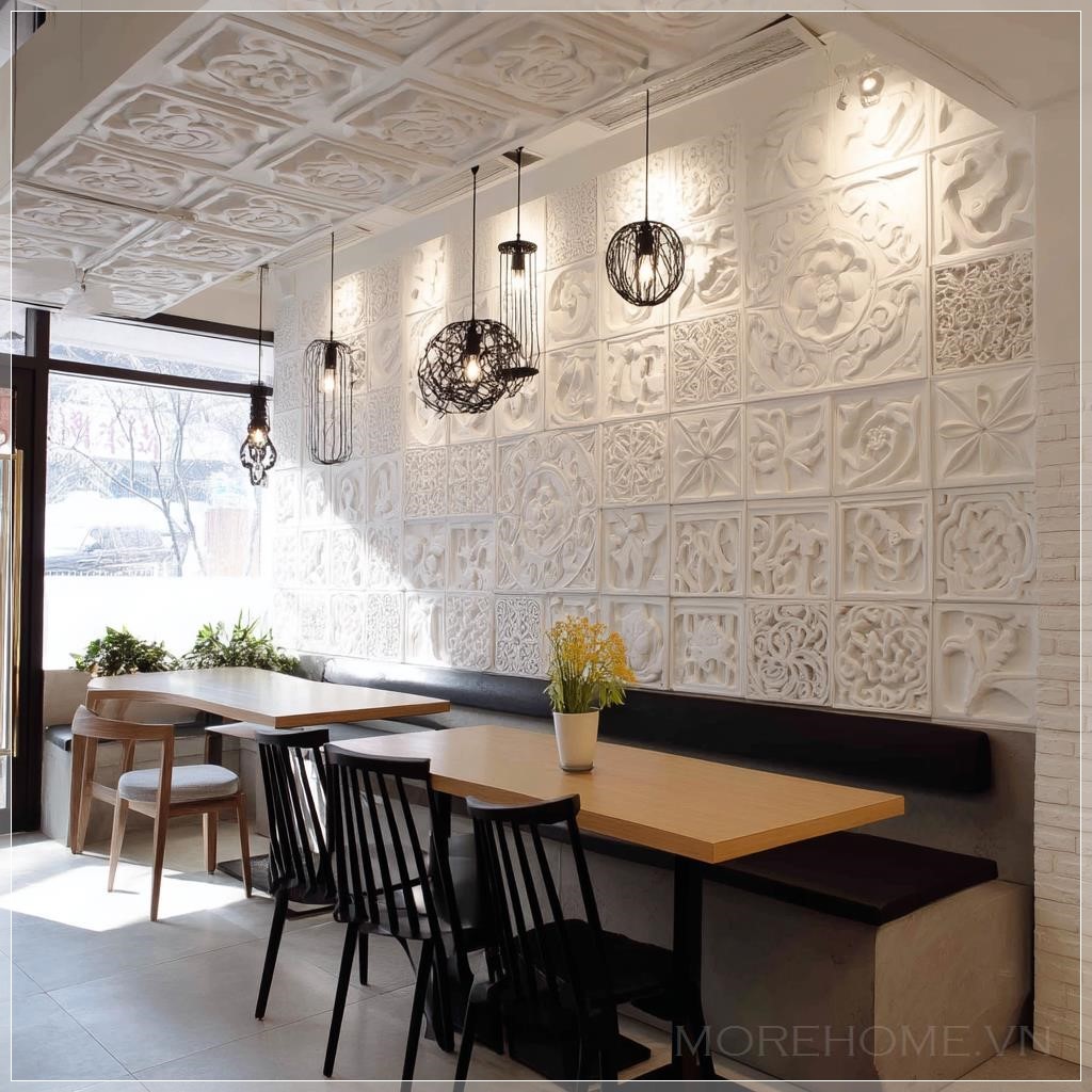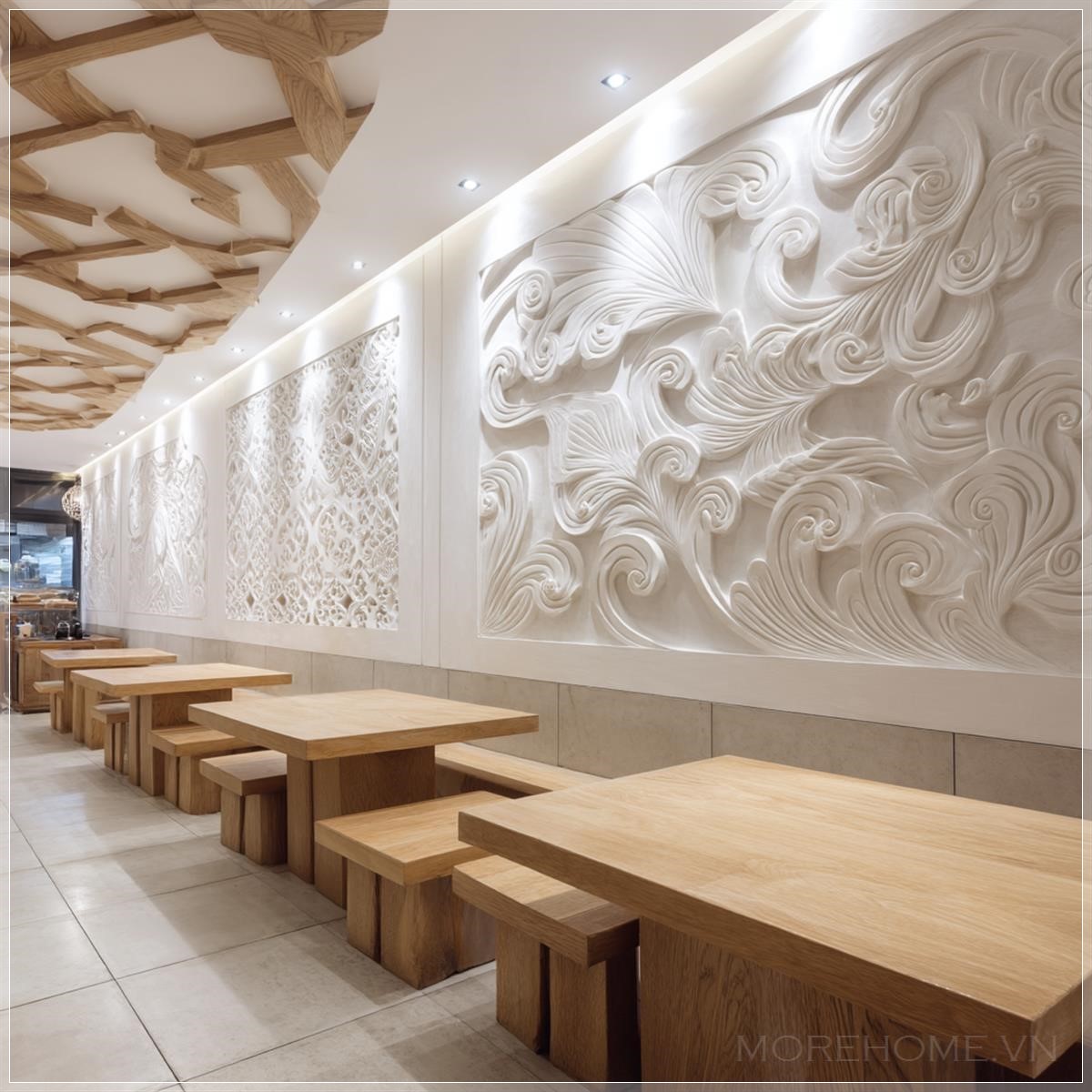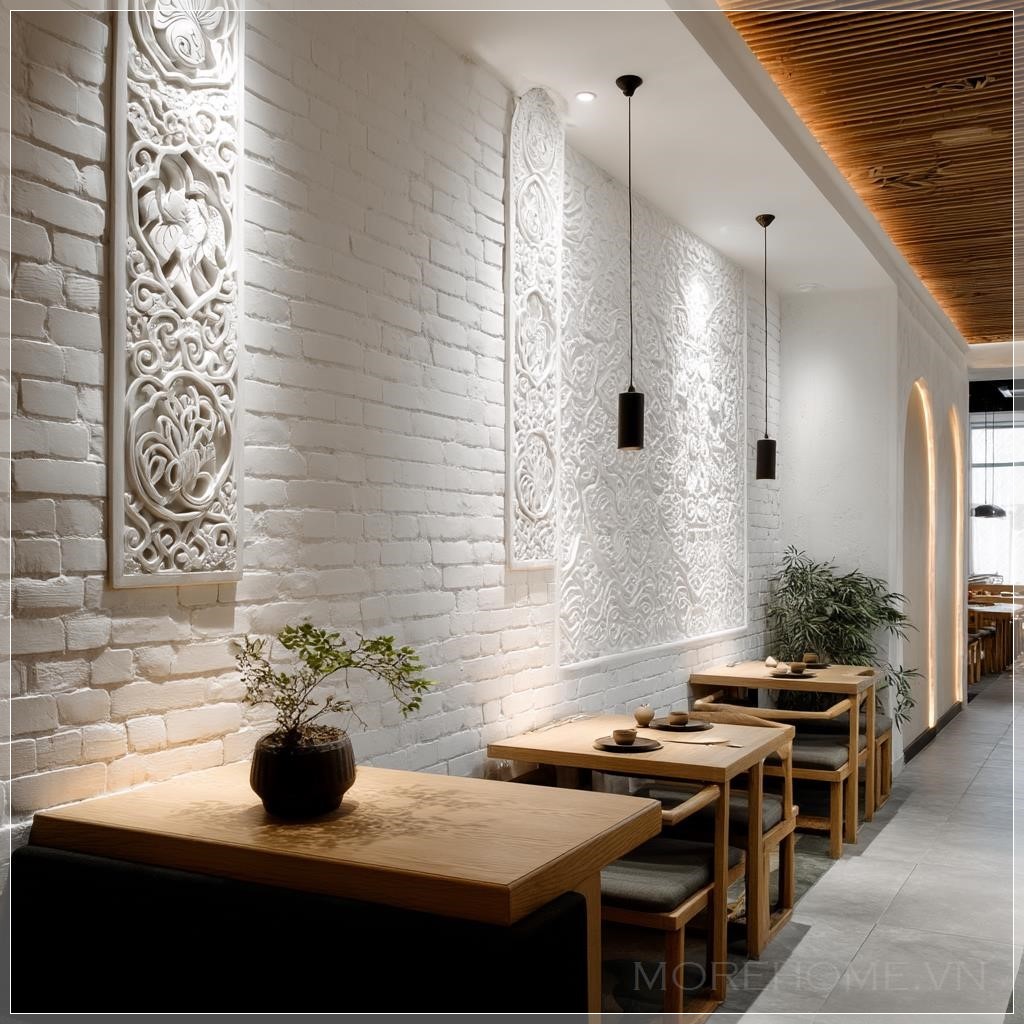 Trong thực tế, không gian nhà hàng này có thể ứng dụng tốt trong các thiết kế nhà hàng, quán cà phê hay những không gian ẩm thực cần sự kết hợp giữa hiện đại và truyền thống. Việc sử dụng tường trắng làm điểm nhấn giúp không gian luôn sáng sủa và rộng rãi, đồng thời các chi tiết trang trí truyền thống sẽ mang lại cảm giác thân thuộc, gần gũi cho khách hàng. Đây là một lựa chọn lý tưởng cho những ai muốn tạo dựng một không gian thoải mái nhưng vẫn đầy tính thẩm mỹ.