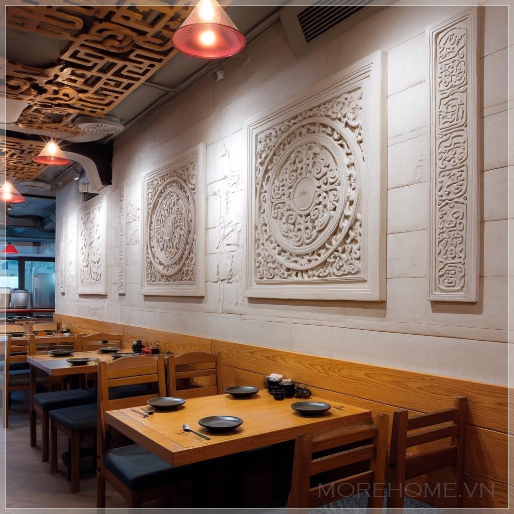 Không gian nhà hàng là nơi không chỉ để thưởng thức những món ăn ngon mà còn để trải nghiệm một không gian ấn tượng và thư giãn. Với thiết kế tường trắng tinh tế, kết hợp với các yếu tố truyền thống của văn hóa Hàn Quốc, không gian nhà hàng này mang đến một vẻ đẹp hài hòa giữa hiện đại và cổ điển. Tông màu trắng chủ đạo tạo nên sự nhẹ nhàng, tươi mới, trong khi gỗ tự nhiên và những chi tiết trang trí truyền thống làm cho không gian thêm phần ấm cúng và gần gũi.