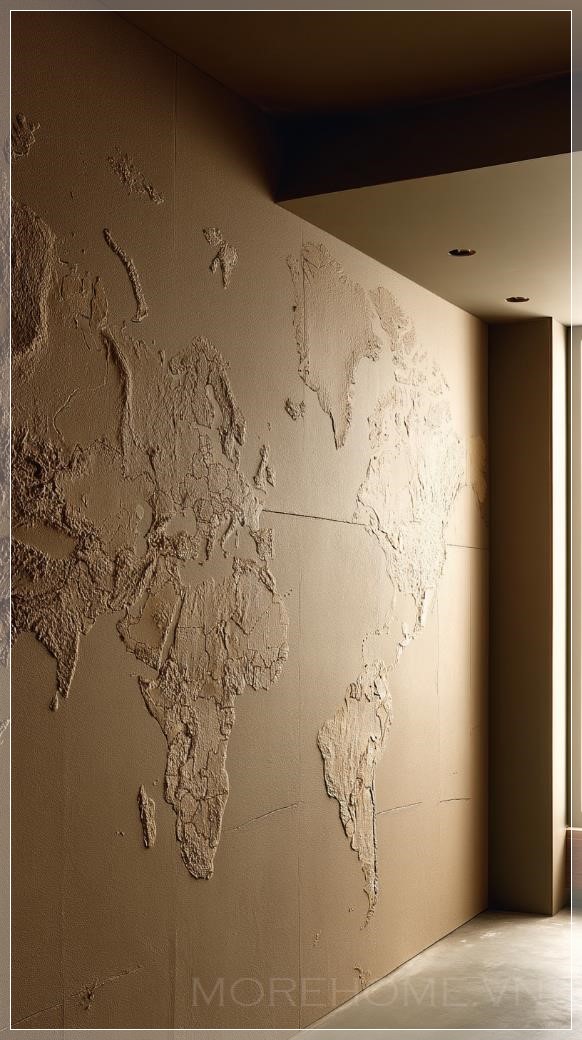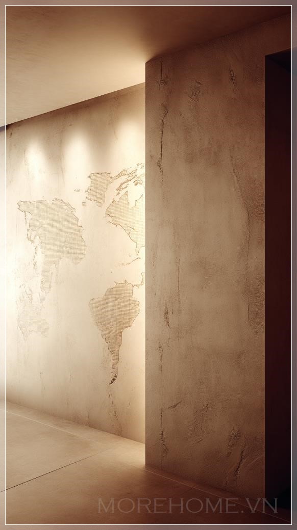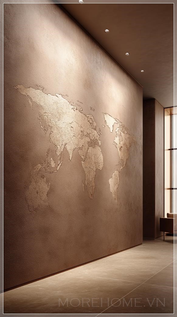 Bức tường còn được thiết kế với một bản đồ thế giới tinh tế, nổi bật nhưng không gây xao nhãng. Bản đồ này được vẽ bằng một màu sắc hơi tương phản, không quá nổi bật nhưng cũng đủ để tạo nên sự thú vị cho bức tường. Tùy vào từng sở thích, bản đồ có thể được làm nổi bật với màu sắc đậm hơn hay nhẹ nhàng hơn, nhưng vẫn đảm bảo không làm mất đi vẻ đẹp thanh thoát của tổng thể thiết kế.