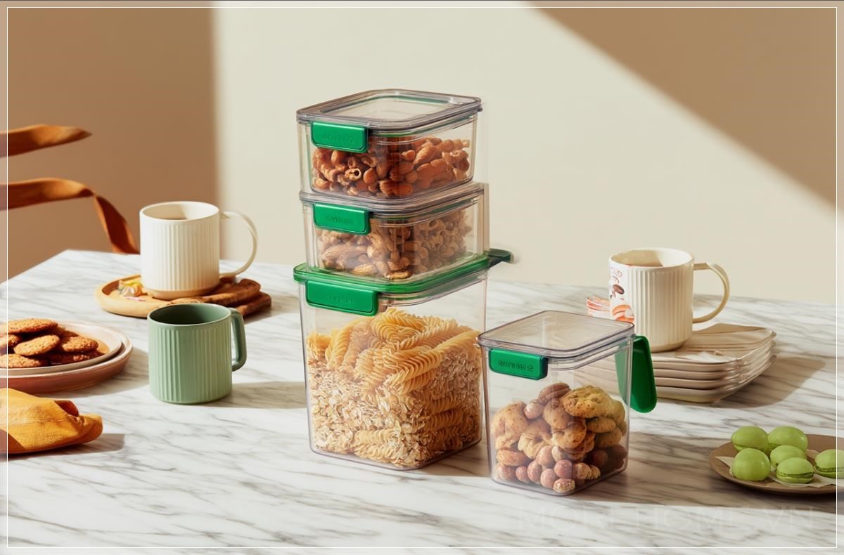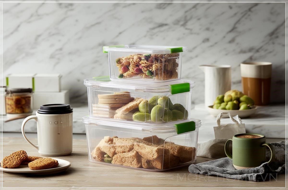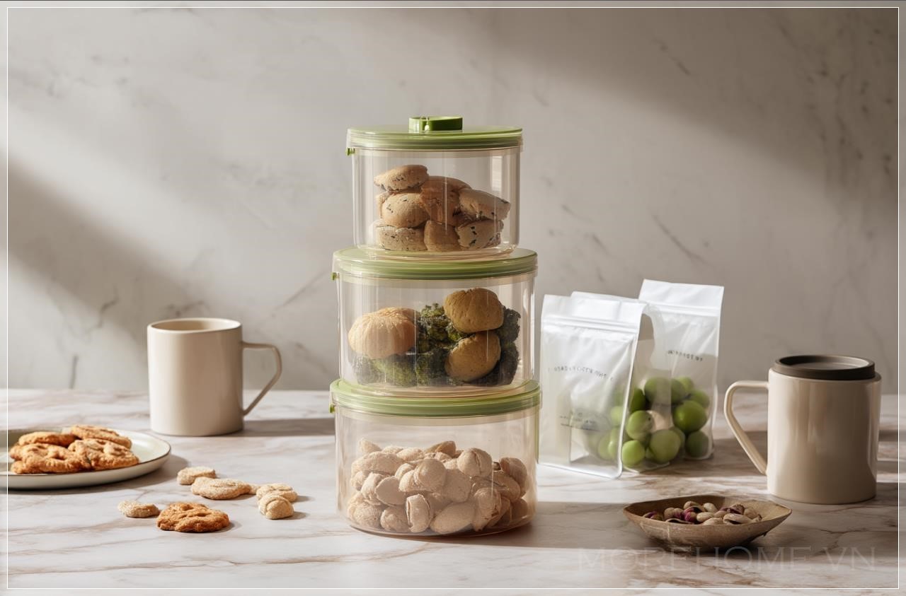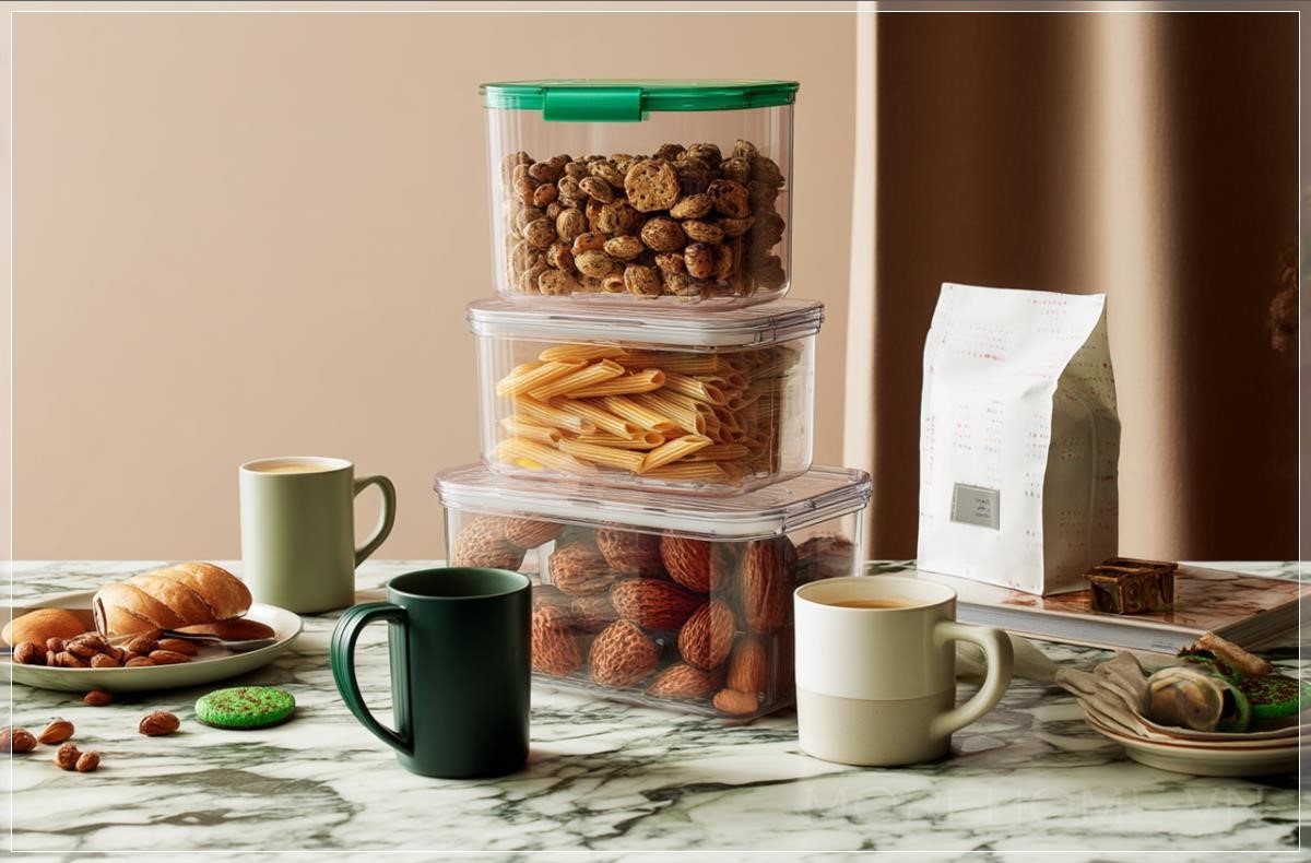 Thiết kế của không gian bếp này bao gồm những chi tiết rất đặc trưng của phong cách hiện đại. Ba chiếc hộp nhựa trong suốt được xếp chồng lên nhau, mỗi hộp đều chứa đầy thức ăn, tạo ra cảm giác ngăn nắp và gọn gàng. Chiếc hộp đầu tiên có tay cầm màu xanh lá nổi bật, thêm vào đó là các món đồ ăn nhẹ như bánh quy, trái cây được bày xung quanh, góp phần tạo nên không gian ấm cúng, dễ chịu. Toàn bộ thiết kế được đặt trước một bàn bếp trống với nền đá marble trắng, tạo nên sự kết hợp hoàn hảo giữa sự hiện đại và sự thanh thoát của không gian bếp.