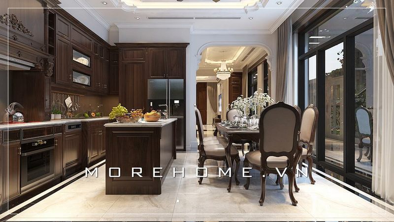 Mẫu tủ bếp gỗ tự nhiên màu nâu trầm cao cấp tạo không gian phòng bếp ấm cúng, sang trọng cho nhà biệt thự