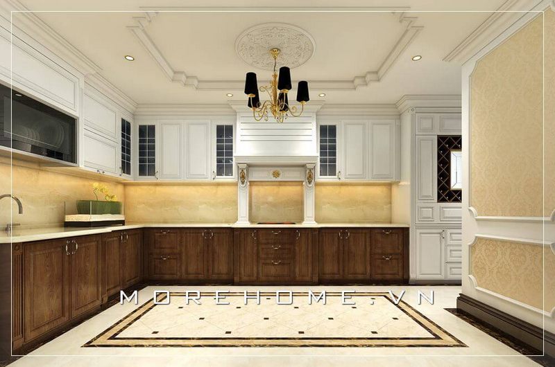 Mẫu phòng bếp vừa kết hợp hài hòa giữa các khu vực vừa tận dụng tối đá mọi công năng nhưng không kém phần rộng rãi