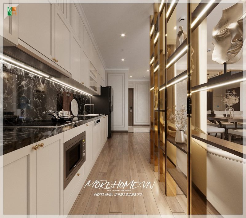 Sắp xếp nội thất phòng bếp hiện đại, sang trọng từ tủ bếp gỗ công nghiệp acrylic đồng màu cùng đá ốp cao cấp.