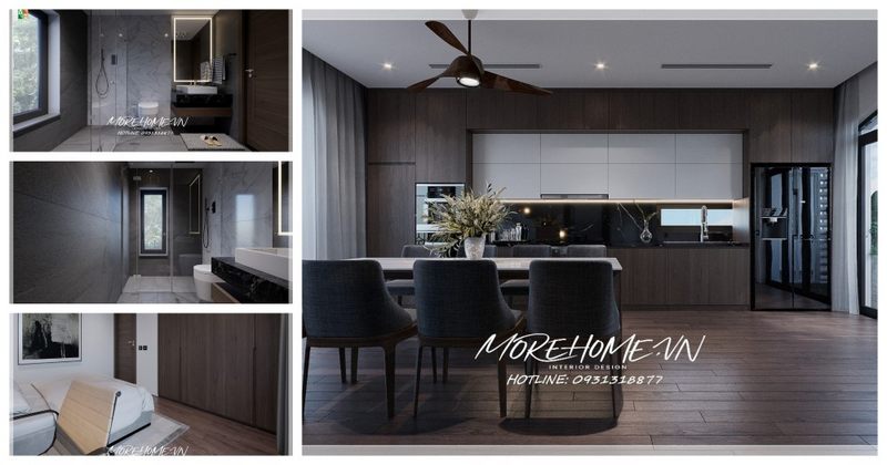 Bố trí phòng bếp của biệt thự, nhà phố theo phong cách hiện đại với tủ bếp hiện đại và các tủ đựng đồ âm tường gọn gàng, ngăn nắp.