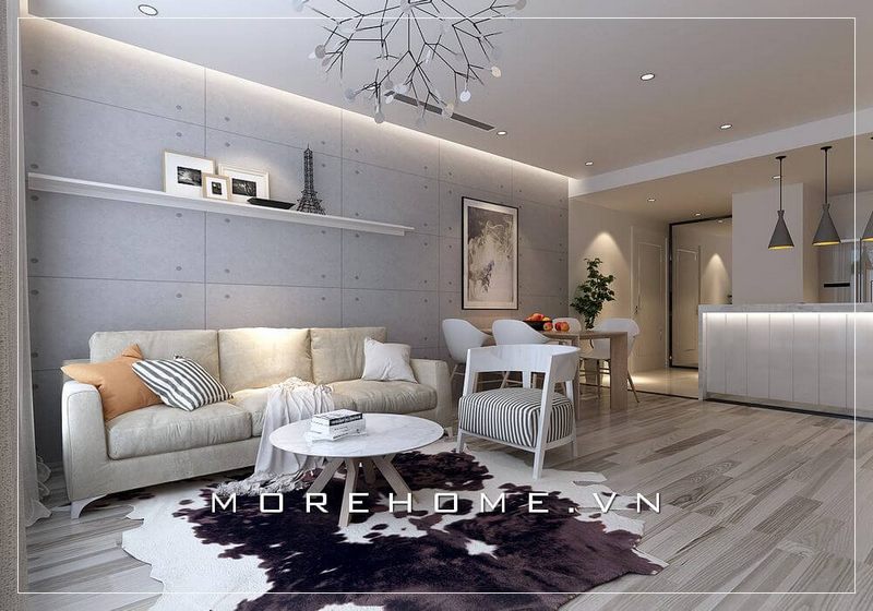 Không gian phòng khách căn hộ chung cư vừa tiện nghi, thoáng đãng lại ấm cúng gần gũi với tâm điểm là bộ sofa văng bọc vải hiện đại sắc kem nhẹ nhàng.