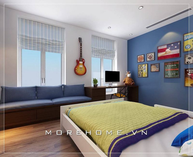 Mẫu sofa văng hiện đại bọc vải màu xanh êm ái tiện lợi nhẹ nhàng được đặt trong phòng ngủ của con giúp con thư giãn và rèn luyện môn học yêu thích của mình.