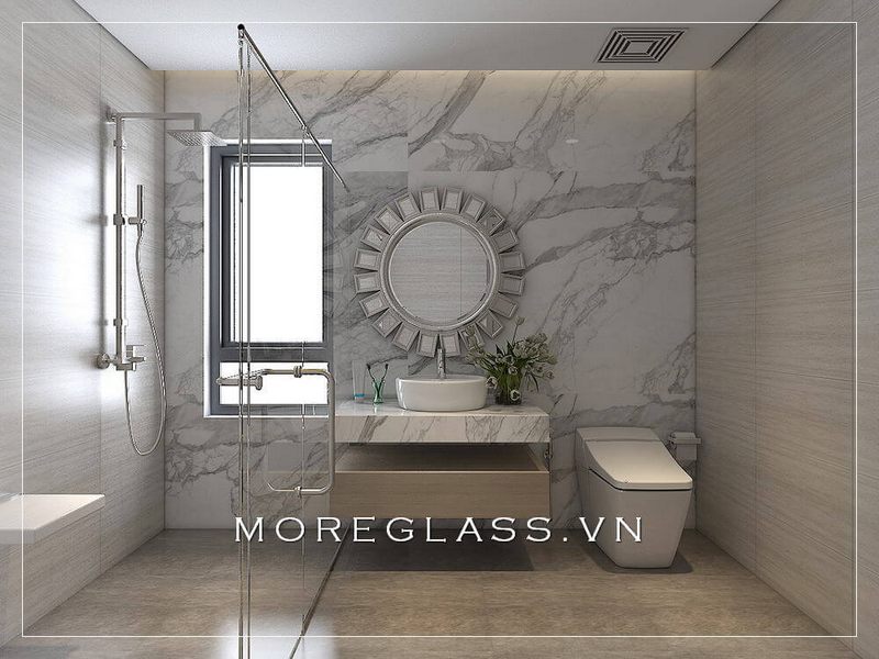 Mẫu thiết kế phòng tắm cao cấp màu trắng trang nhã, đá ốp tường góp phần tạo nên cảm giác thoải mái, rộng rãi.