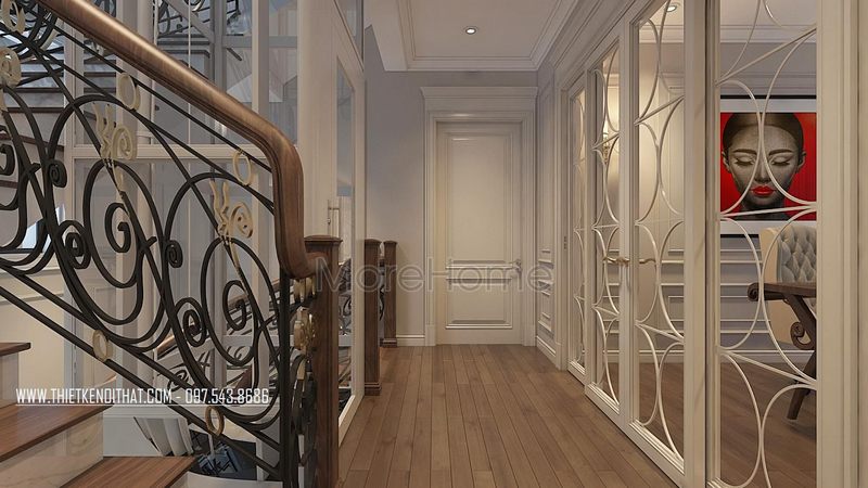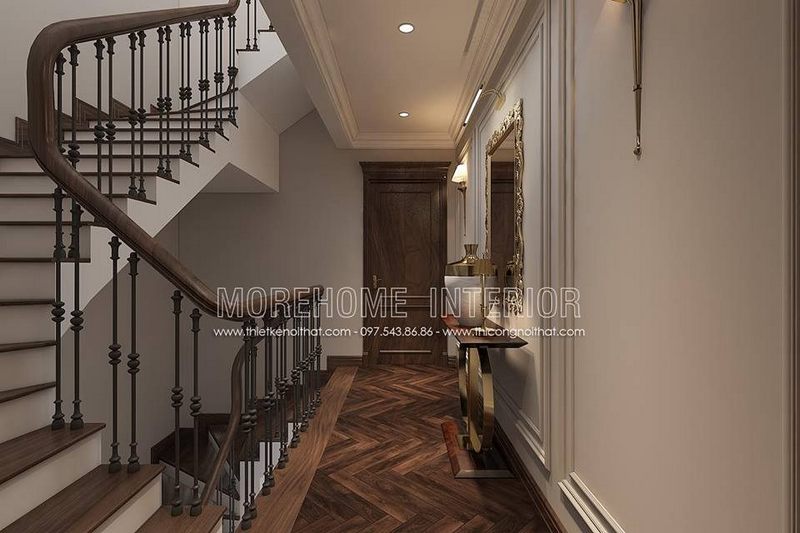 Cầu thang tân cổ điển có kích thước vừa đủ làm cho bạn có thể dừng lại để nghỉ ngơi trước khi bước vào các căn phòng khác nhau.