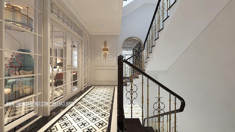 Cầu thang tân cổ điển được thiết kế dạng hình chữ nhật dài với 2 màu sắc đối lập nhau giúp không gian trở nên rộng rãi hơn.