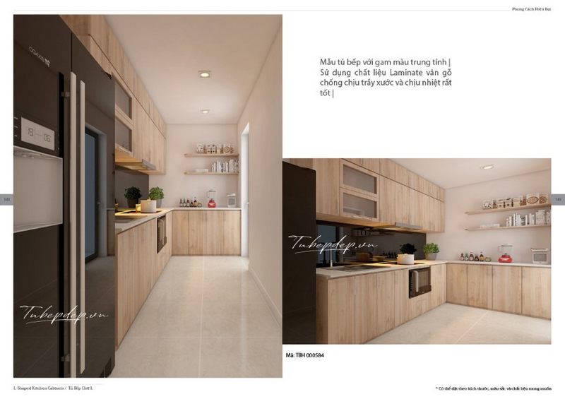 Thiết kế tủ bếp hiện đại chữ L, có đầy đủ thiết bị rất hữu dụng trong khu bếp mang đến không gian bếp tiện dụng