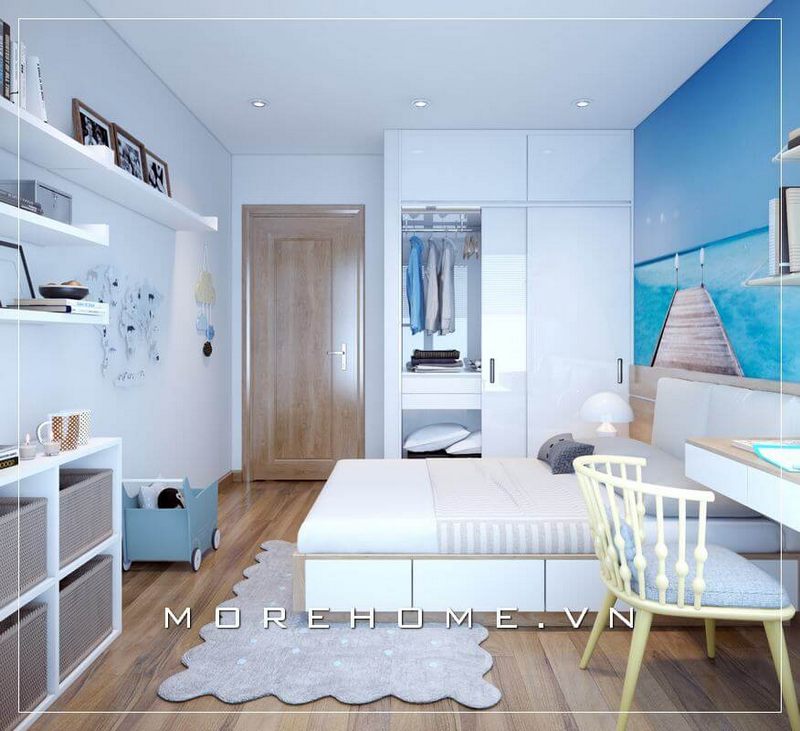 Mẫu thiết kế phòng ngủ hiện đại dành cho bé với tone màu trắng chủ đạo. Mọi thứ đều được tối giản hóa nhằm mang lại một không gian phòng ngủ thông thoáng và gọn gàng nhất.